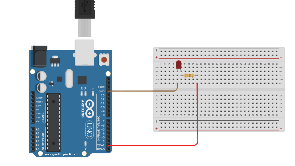 Direnç, dijital pin 1’den gelen akımı sınırlar (LED’in zarar görmemesi için kullanılır). Direncin diğer ucunu Arduino dijital pin 1’e bağla.